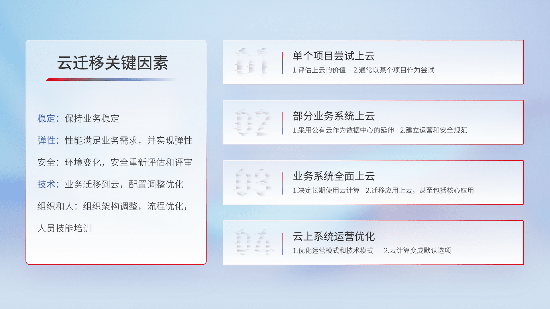 结合实际业务,,,从规划设计、、云平台选型、、、、云原生改造、、、数据迁移、、集成交付,,,迁移全过程为客户识别最佳上云路径,,做好风险识别管理,,,设计网络架构、、身份权限、、、、安全审计合规、、、操作审计、、、日志审计、、监控告警策略、、多站点容灾设计等,,,对云上基础设施进行整体规划,,,,提升IT治理水平,,,,以满足弹性、、高可用、、高性能的需求。。。